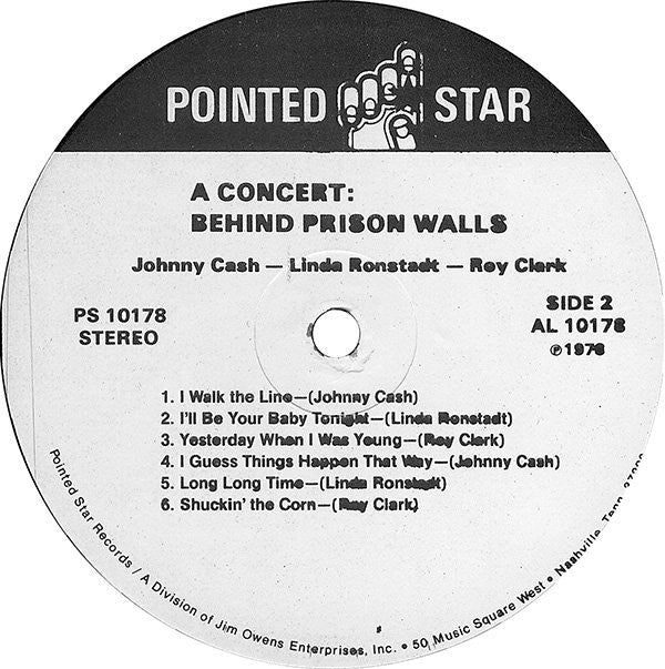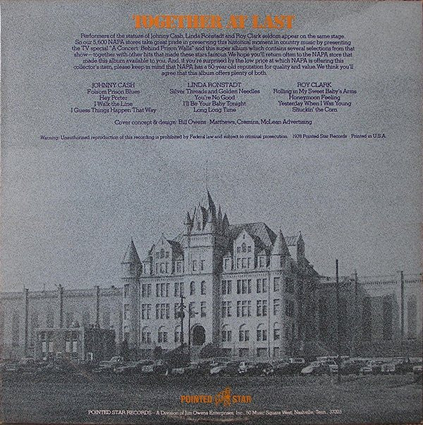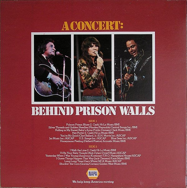 A3: Public Domain. Unipack sleeve with a die-cut gatefold depicting the album's 3 stars behind bars. NOTE: This is not a "live" recording...all tracks are studio recordings. TOGETHER AT LAST: Performers of the statures of Johnny Cash, Linda Ronstadt and Roy Clark seldom appear on the same stage. So our 5,600 NAPA stores take great pride in preserving this historical moment in country music by presenting the TV special "A Concert: Behind Prison Walls" and this super album which contains several selections from that show - together with other hits that made these stars famous. We hope you'll return often to the NAPA store that made this album available to you. And, if you're surprised by the low price at witch NAPA is offering this collector's item, please keep in mind that NAPA has a 50-year-old reputation for quality and value. We think you'll agree that this album offers plenty of both. A1, A4, B1: Hi-Lo Music/BMI A2: Central Songs Inc./BMI A3: Clark Music/BMI A5: E.H. Morris Inc./ASCAP Jac Music Inc./ASCAP U.S. Songs Inc./ASCAP Blue Seas Inc./ASCAP A6: Acoustic Music/BMI B2: Dwarf Music/ASCAP B3: T.R.O. Hampshire House/ASCAP B4: Knox Music/BMI B5: MCA Music/ASCAP B6: Golden West Music/BMI A3 (Public Domain) ℗ 1978