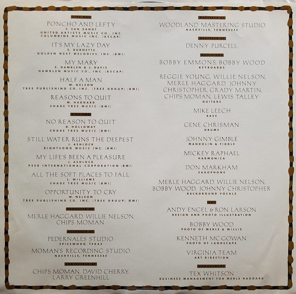 Recorded at Perernales Studio, Spicewood, Texas, Moman's Recording Studio, Nashville, Tennessee Mastered at Woodland Mastering Studio, Nashville, Tennessee. ©1982 CBS Inc./ ℗1982 CBS Inc./ Manufactured by Epic Records/ CBS Inc. A1: United Artists Music Co., Inc. Columbine Music Inc. (ASCAP) A2: Golden West Melodies, Inc. (BMI) A3: Hamblen Music Co., Inc. (ASCAP) A4, B5: Tree Publishing Co. Inc. (Tree Group) (BMI) A5, B1, B4: Shade Tree Music (BMI) B2: Rightsong Music Inc. (BMI) B3: Peer International Corporation (BMI) Unlike [r1539065, which was pressed with stampers from the Pitman plant, this version was wholly pressed at the Carrollton plant.