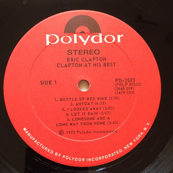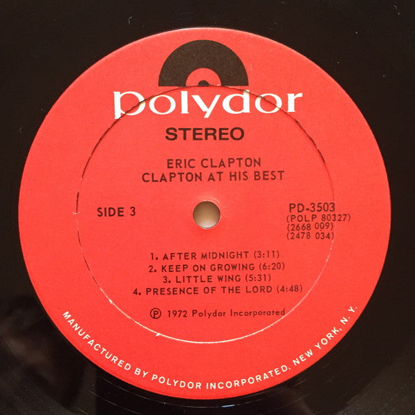 Top folding envelope sleeve with "AT HIS BEST". First cat # on jacket, second cat # on labels. This PRC pressing has variation in text font/format on labels: unlike many US Polydor releases with this catalog no., here the catalog and matrix numbers are to right of spindle hole but unlike [r5358548 the track titles are centered, not aligned left. Title on labels is "CLAPTON AT HIS BEST" Title on spine is "ERIC CLAPTON / AT HIS BEST"