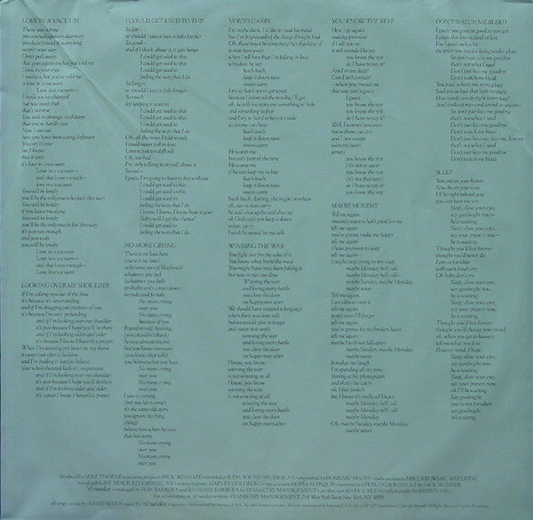 "G" in runouts denotes a [l442751 pressing. Recorded at R.P.M. Sound Studios, NY. Mixed at Right Track Recording, NY. Mastered at Sterling Sound, NY. © 1985 CBS Inc./℗ 1985 CBS Inc./Manufactured by Epic Records/CBS Inc. © 1984 and 1985 by Intersong-U.S.A., Inc. and 'til tunes associates. All rights administered by Intersong-U.S.A., Inc. (ASCAP) International Copyright Secured.